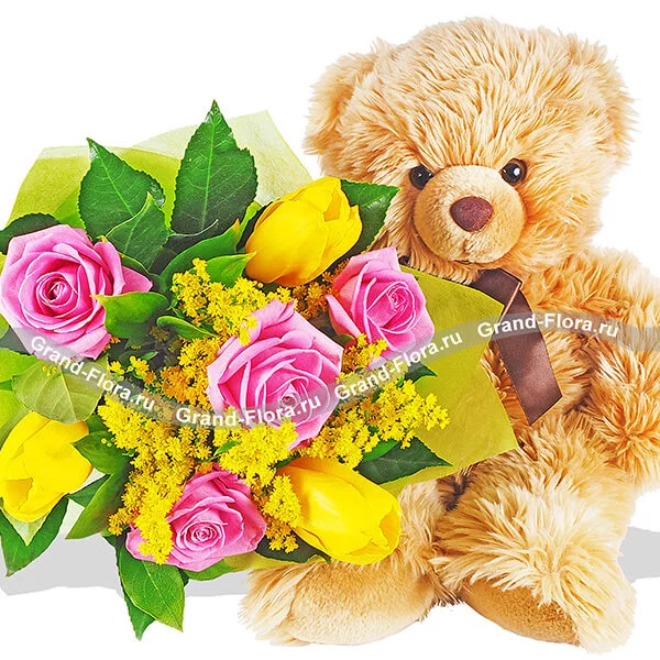 Уменьшенный: роза розовая - 4 шт., тюлпаны желтые - 3 шт., солидаго - 3 шт., декоративная зелень, фетр желтый + мягкая игрушка "Медведь" - 15-20 см.