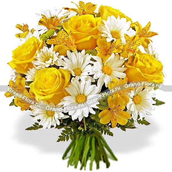 Солнечный букет непременно привлечет внимание получателя своей цветовой палитрой.