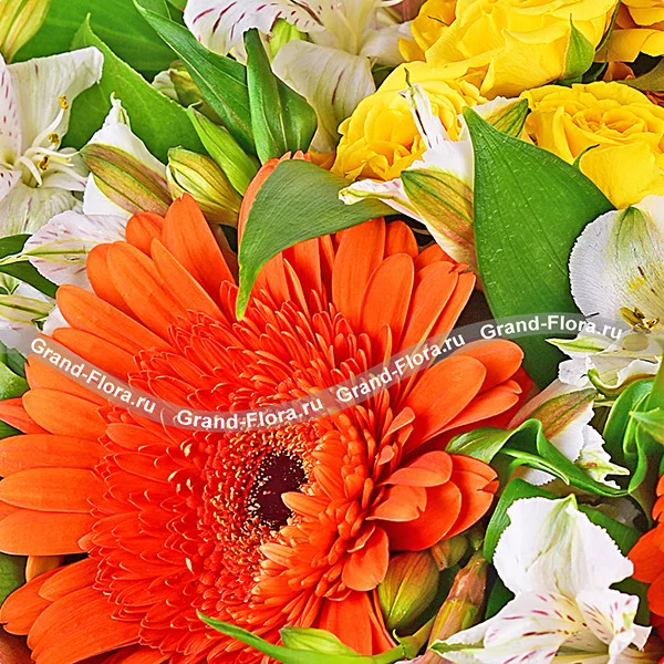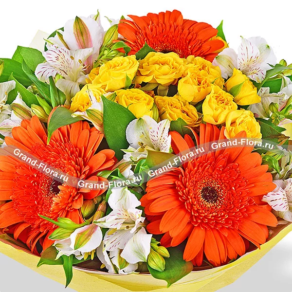 Смешанный выразительный букет из огненно-оранжевых гербер, желтых роз и нежных белых альстромерий великолепно дополнен рускусом. Яркий букет будет отличным дополнением к подарку в день рождения любимой мамы или сестры, а также выражением благодарности дорогой подруге или коллеге
